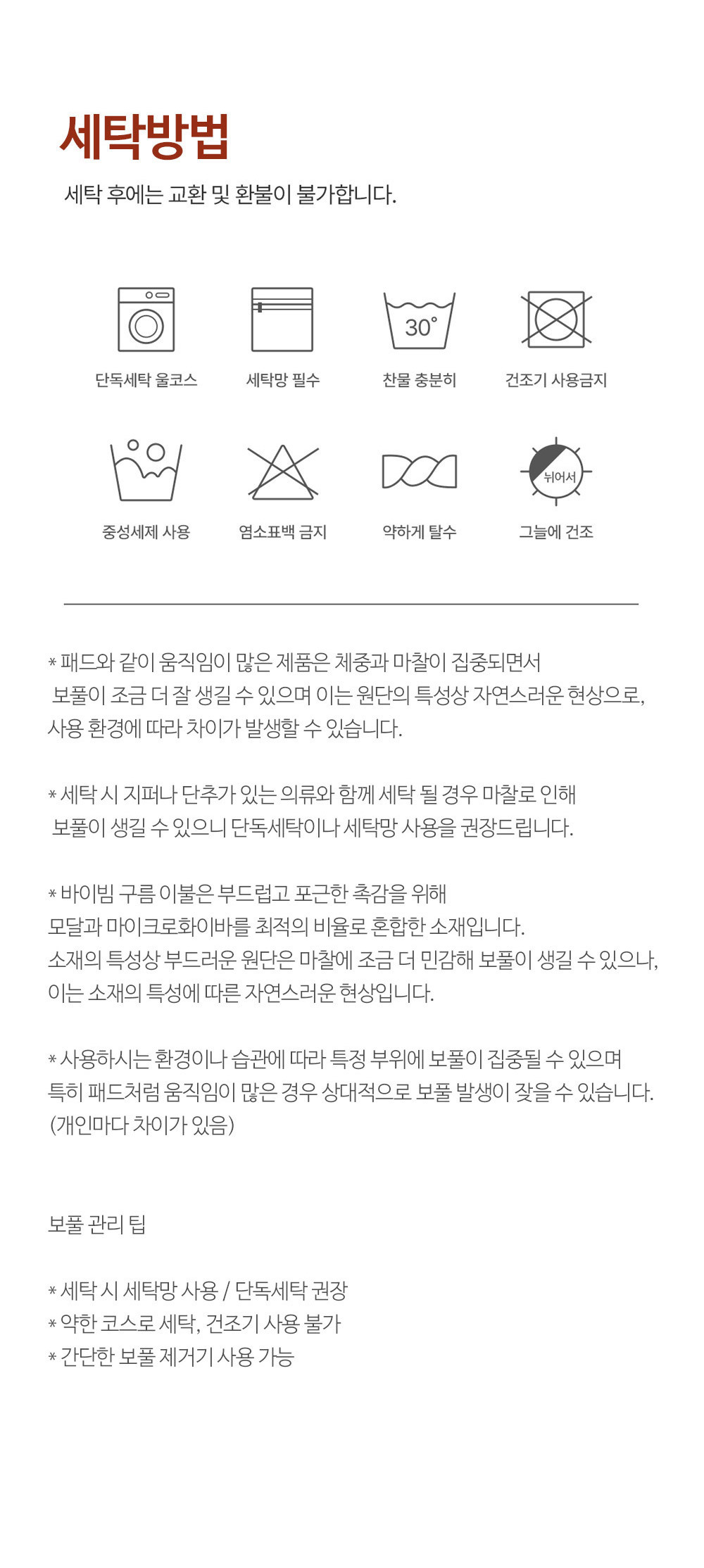 - 교환은 색상 교환만 가능하며, 다른 제품으로 변경 또는 사이즈 변경은 반품 후 재구매 해주셔야 합니다.